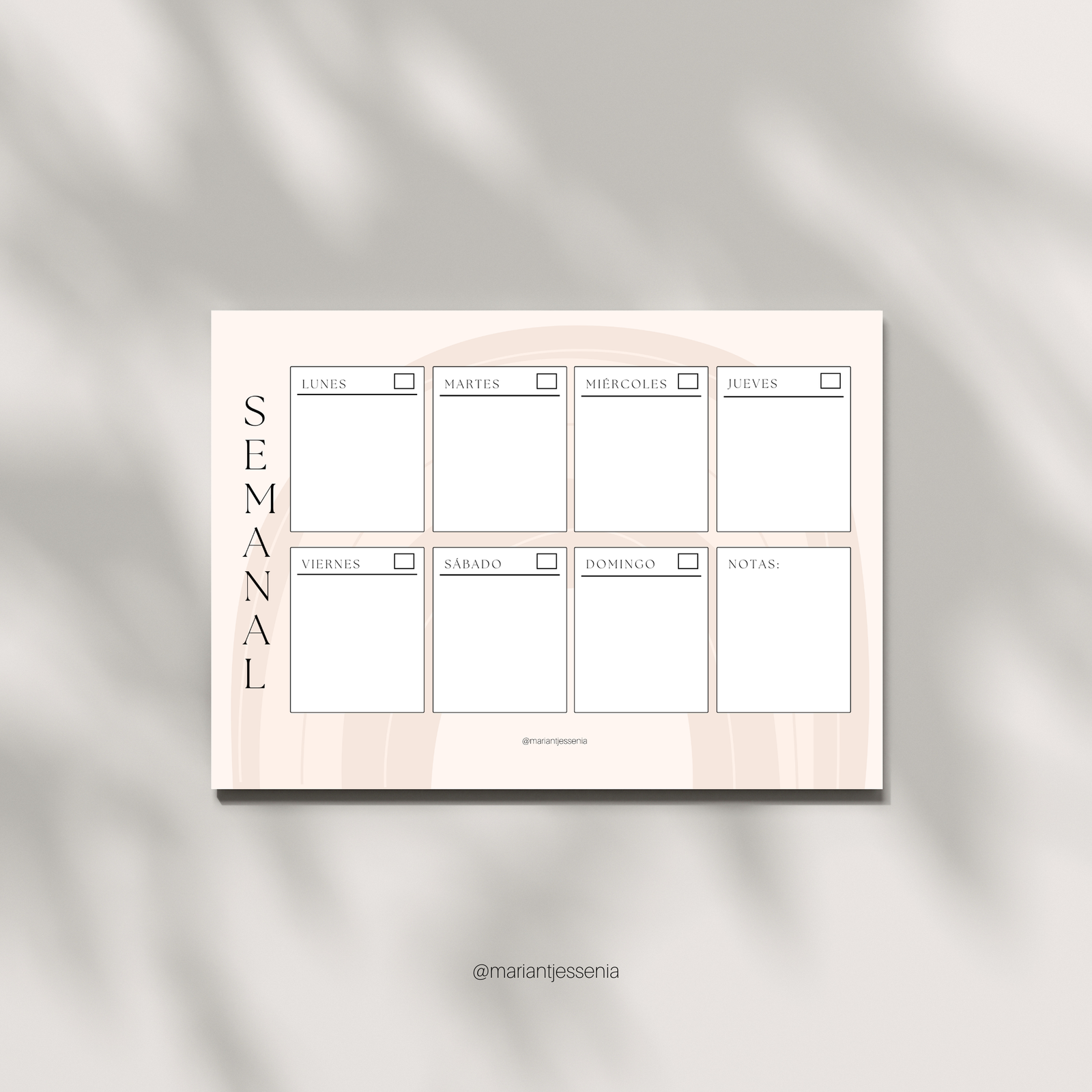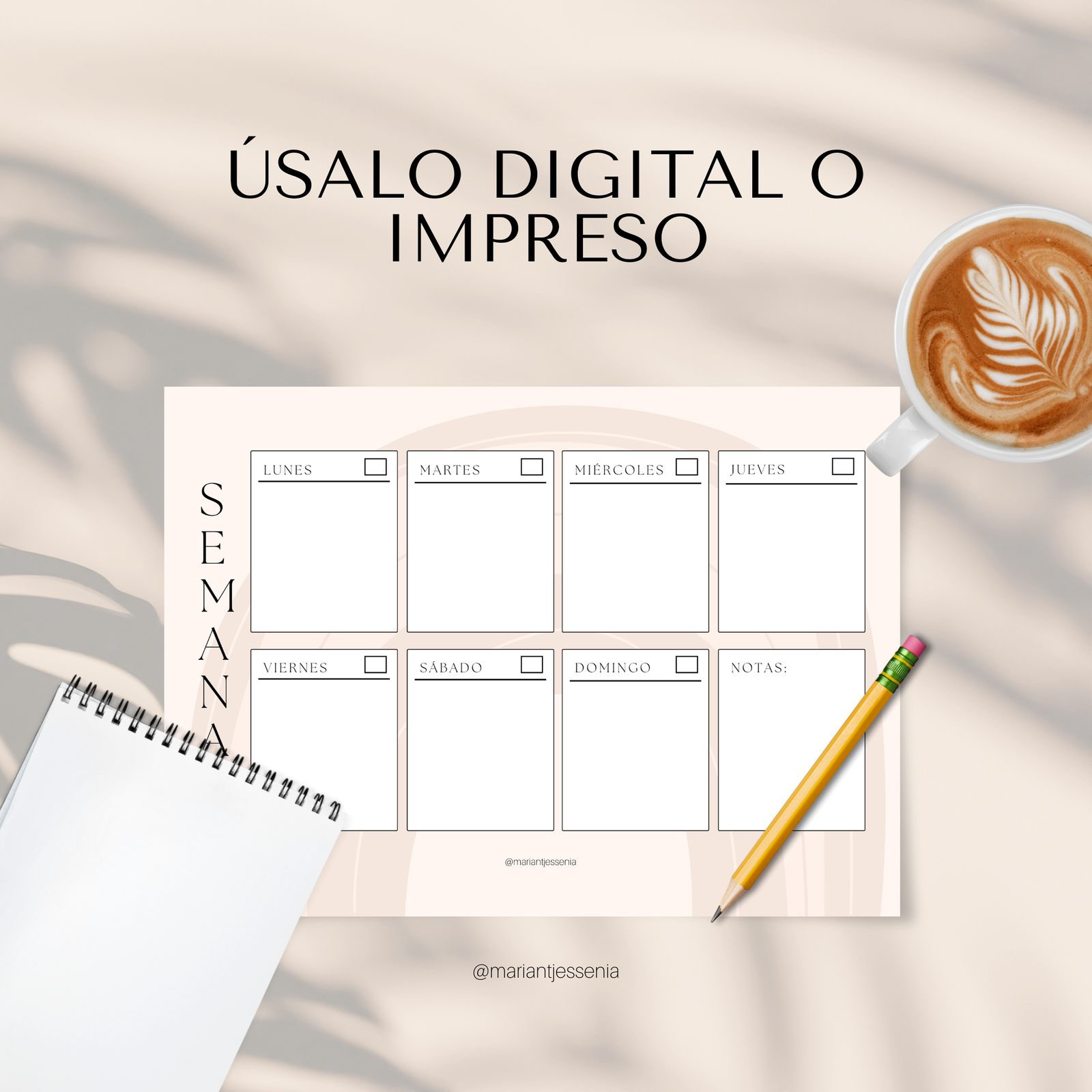 Calendario semanal diseñado para adaptarse a tus necesidades diarias. Ya sea que lo prefieras usar digitalmente o impreso, este calendario te ofrece la flexibilidad ideal para planificar tus tareas y mantenerte organizado, sin importar el ámbito de tu vida: proyectos personales, estudios o trabajo.